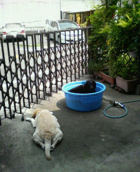 沙羅は水を撒いた上に寝そべるのが好きです。