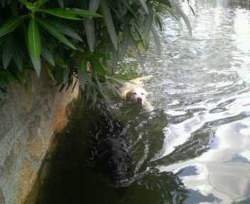 写真は気持ちよさそうに泳ぐ二匹と、川の中の石や魚が気になって凝視する(狙う)多紀です。