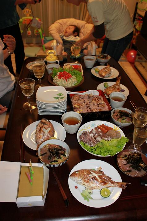 こま婆が作ってきてくれた鯛の塩焼きに栗入り赤飯に、マグロの漬け&オクラと納豆の丼、ポテトサラダ、ミオミオのたこ焼き。そして義母作の鶏肉のワイン煮。