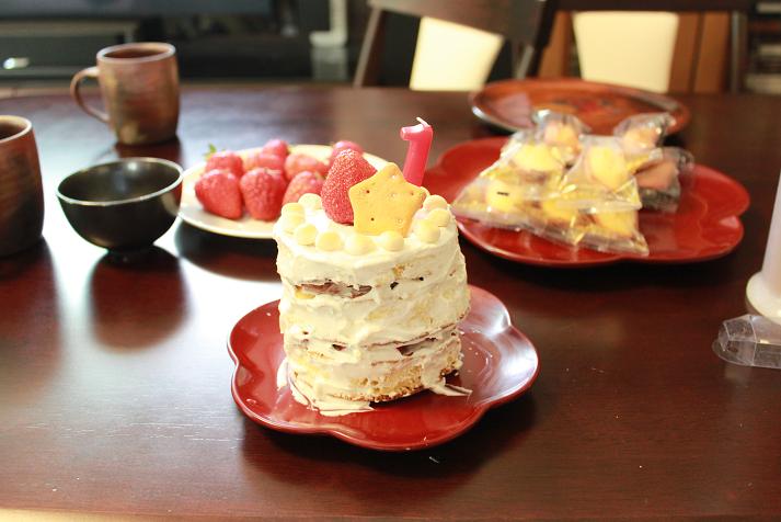 ホットケーキを水きりヨーグルトとお菓子でデコレーションしたケーキにろうそくを立ててお祝いしました。