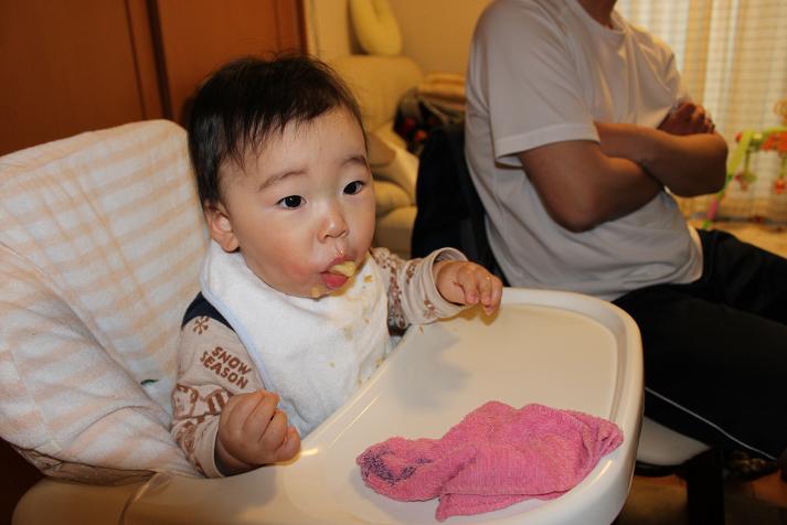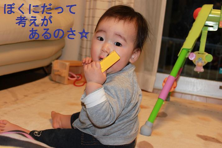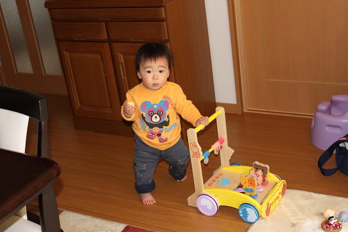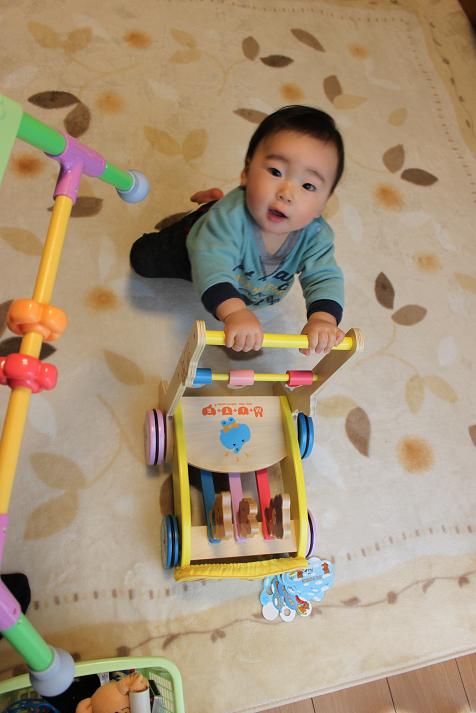 爺婆にカタカタを買ってもらって、ちょっと早いんだろうけれど立てひざでご機嫌に押して歩いている秀敏です。